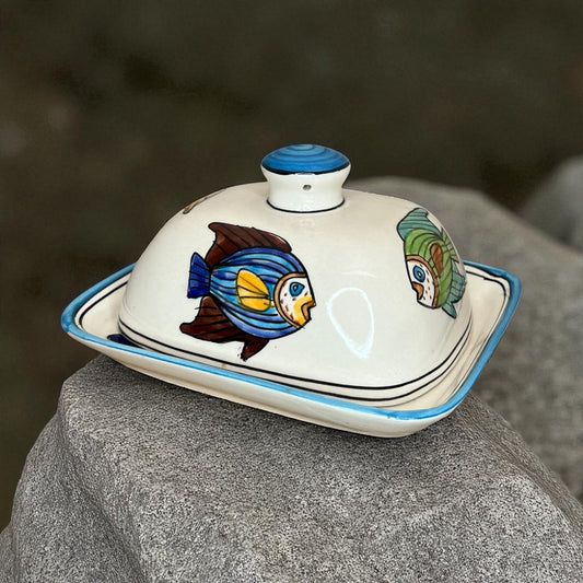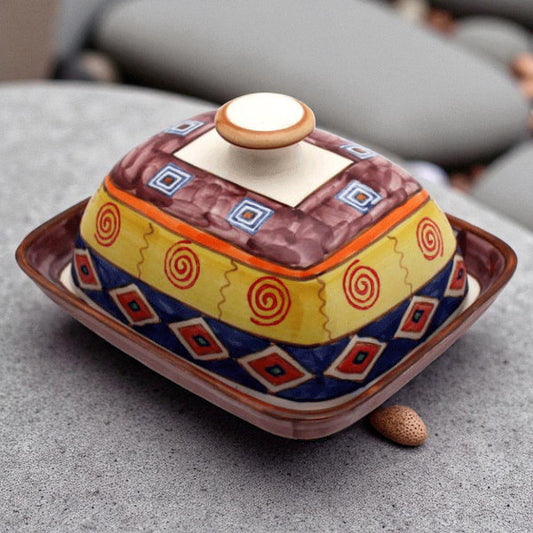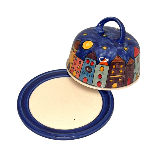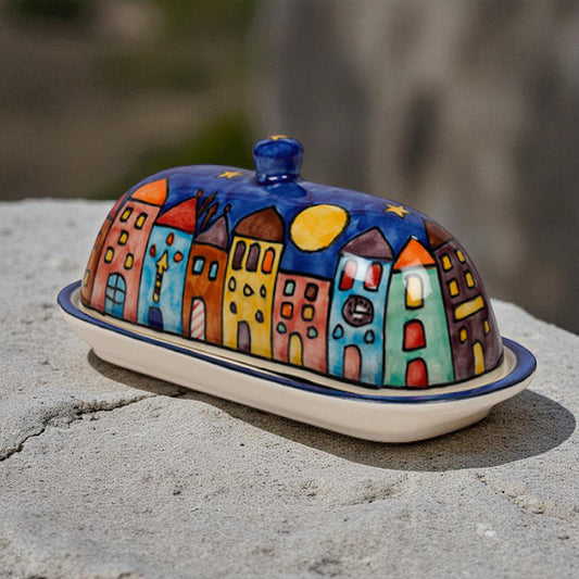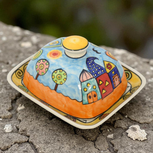 Handbemalte Keramik Butterdose mit Stadtmotiv