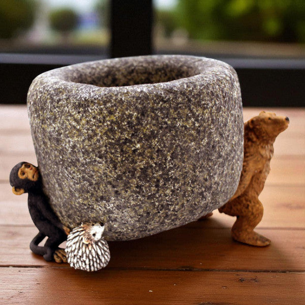 Eine schöne Pflanzenschale mit einem Bären, Affen und Igel, die versuchen die Schale gemeinsam zu tragen. Nur zusammen sind sie stark! Die realistische Steinoptik macht diese Dekoration zu einem echten Hingucker.