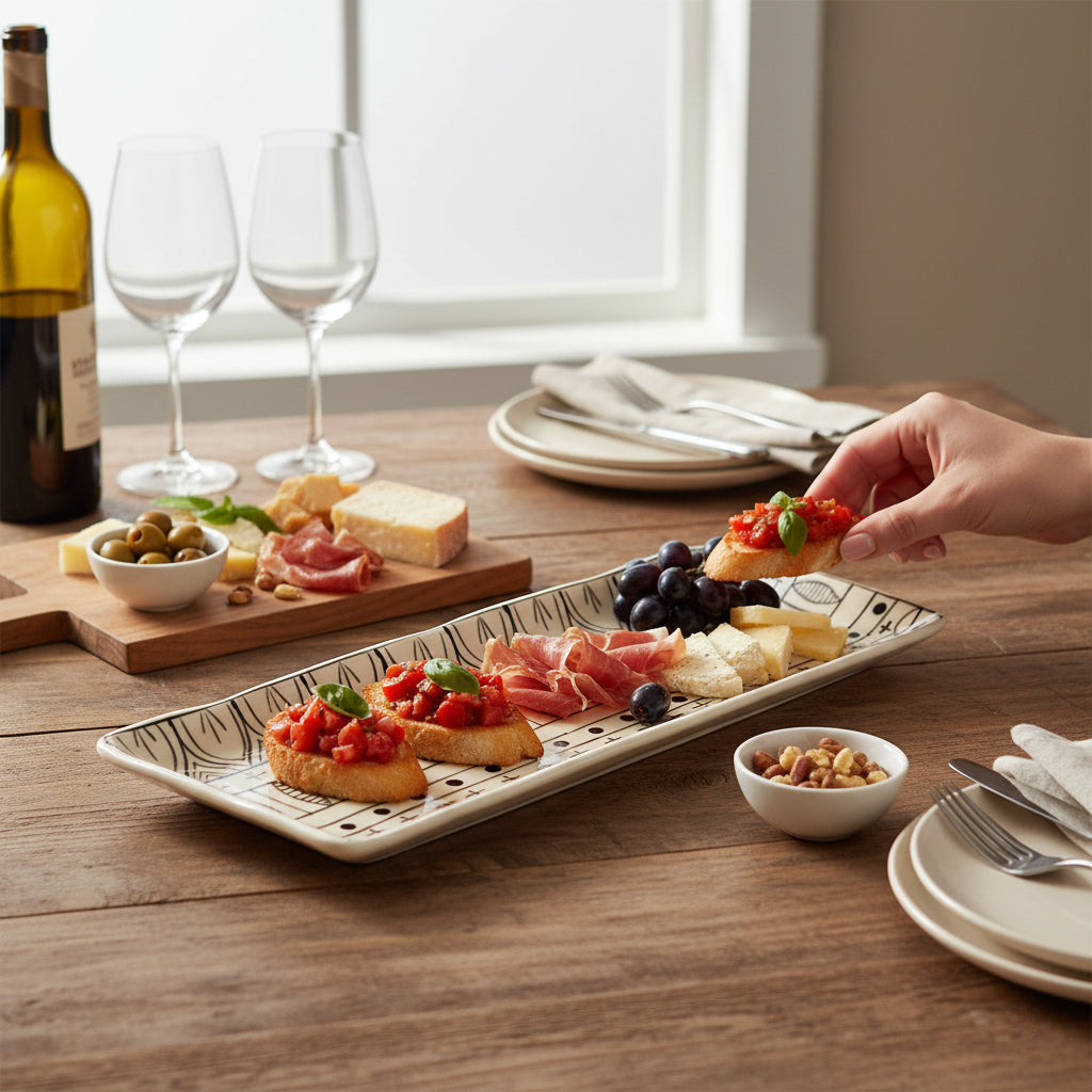 Diese große rechteckige Servierplatte in elegantem schwarz-weiß ist liebevoll handbemalt und perfekt für stilvolles Servieren. Ein echter Hingucker auf jeder Tafel.