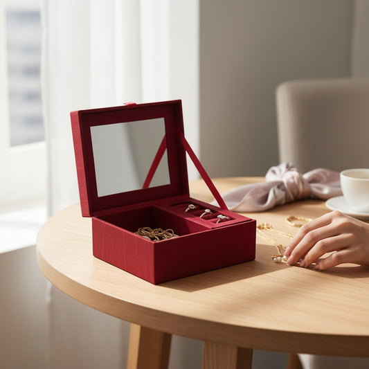 Schmuckschatulle rot handbestickt - Mit Spiegel & Ringhalter