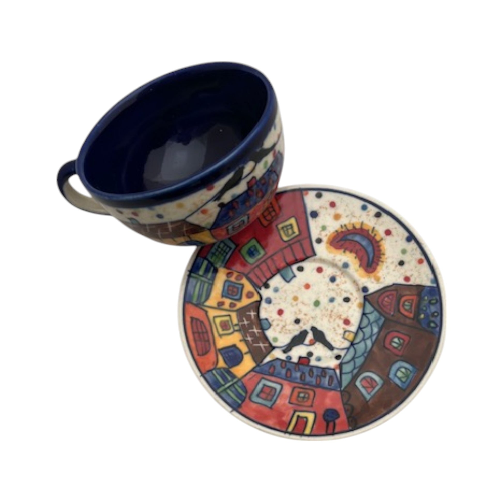 Cette magnifique tasse à café avec sa soucoupe assortie, issue de la collection Village, capture l'atmosphère romantique d'un paysage urbain – parfaite pour le cappuccino et autres boissons chaudes.