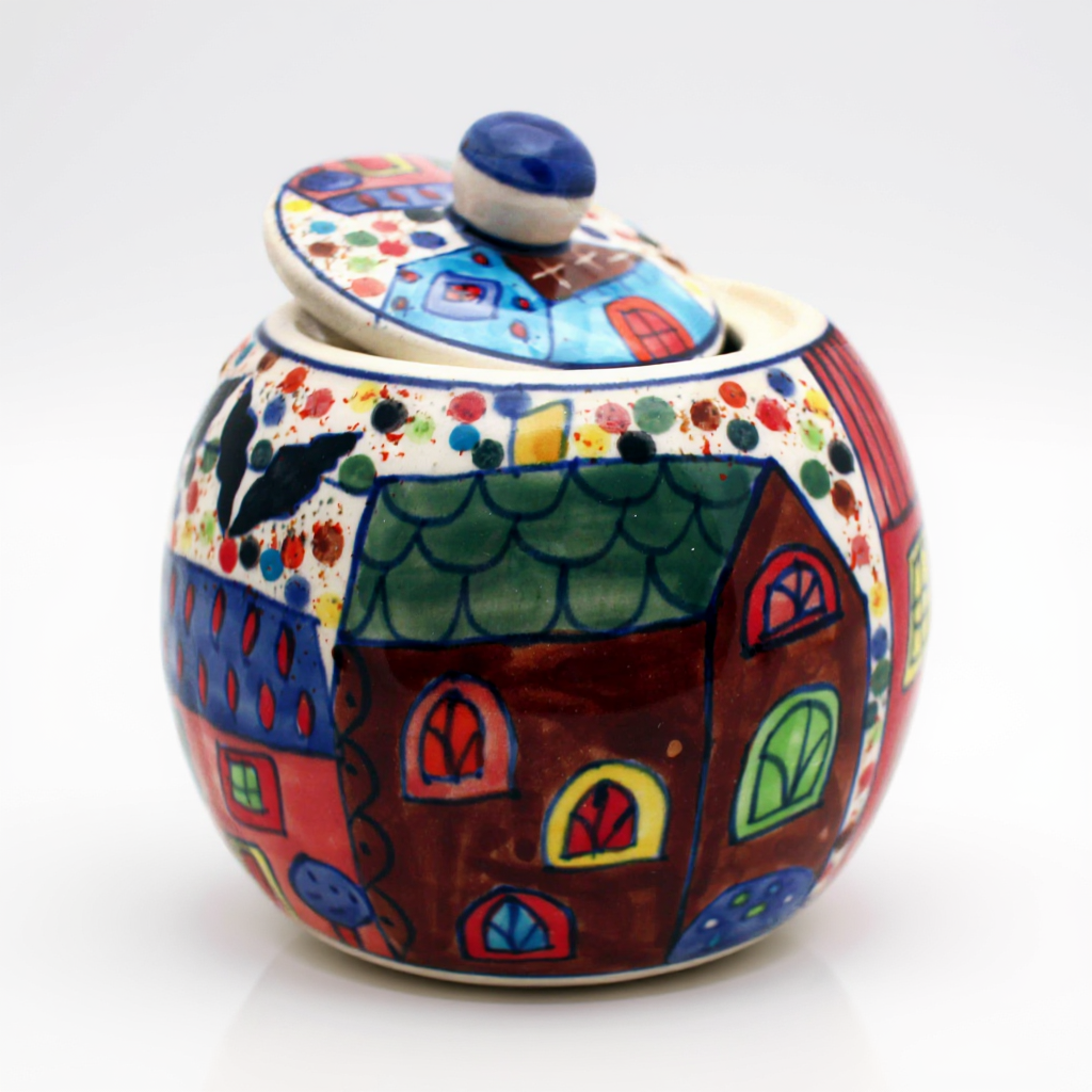 Pot rond en céramique peint à la main avec couvercle, sucrier, pot à biscuits avec motif coloré Happy House