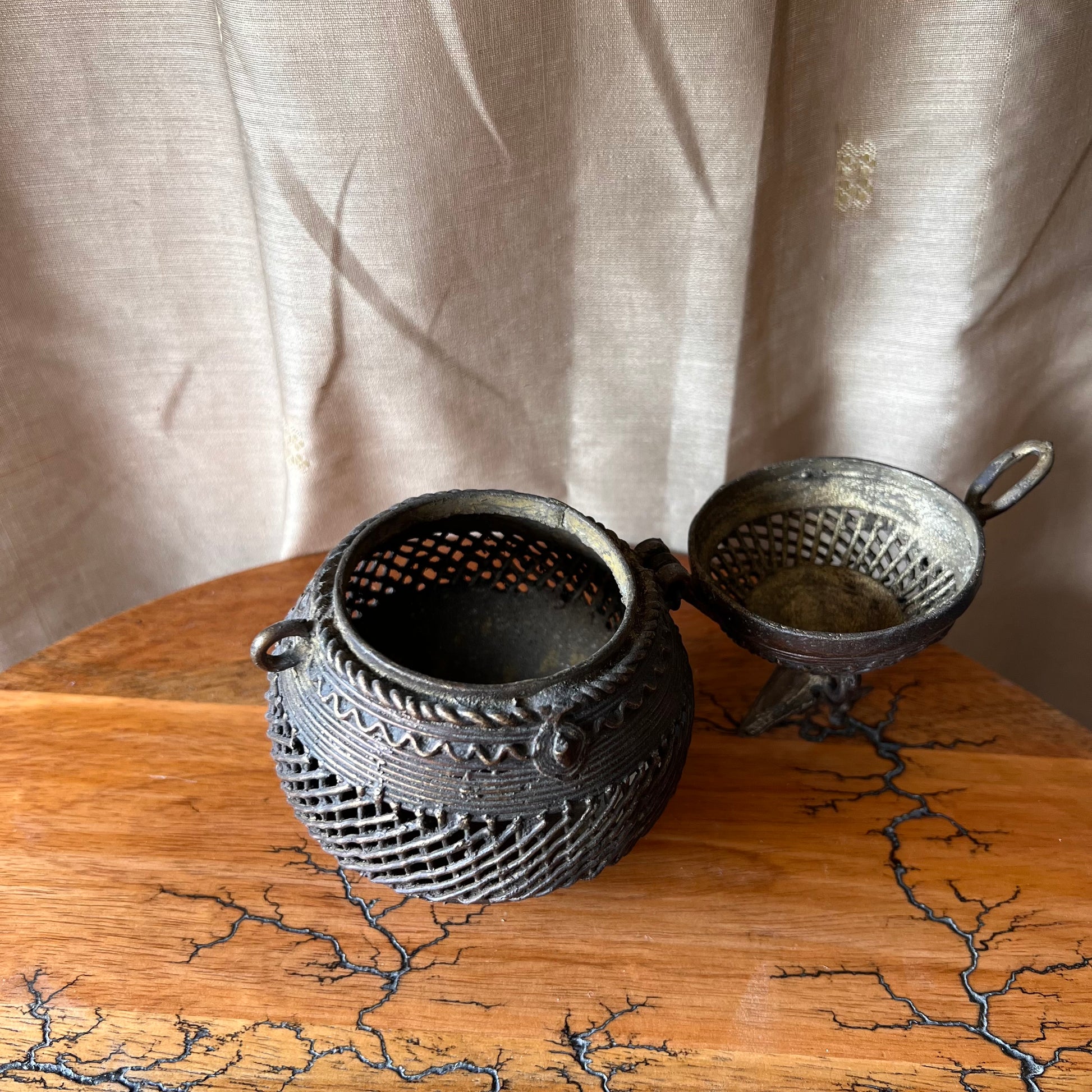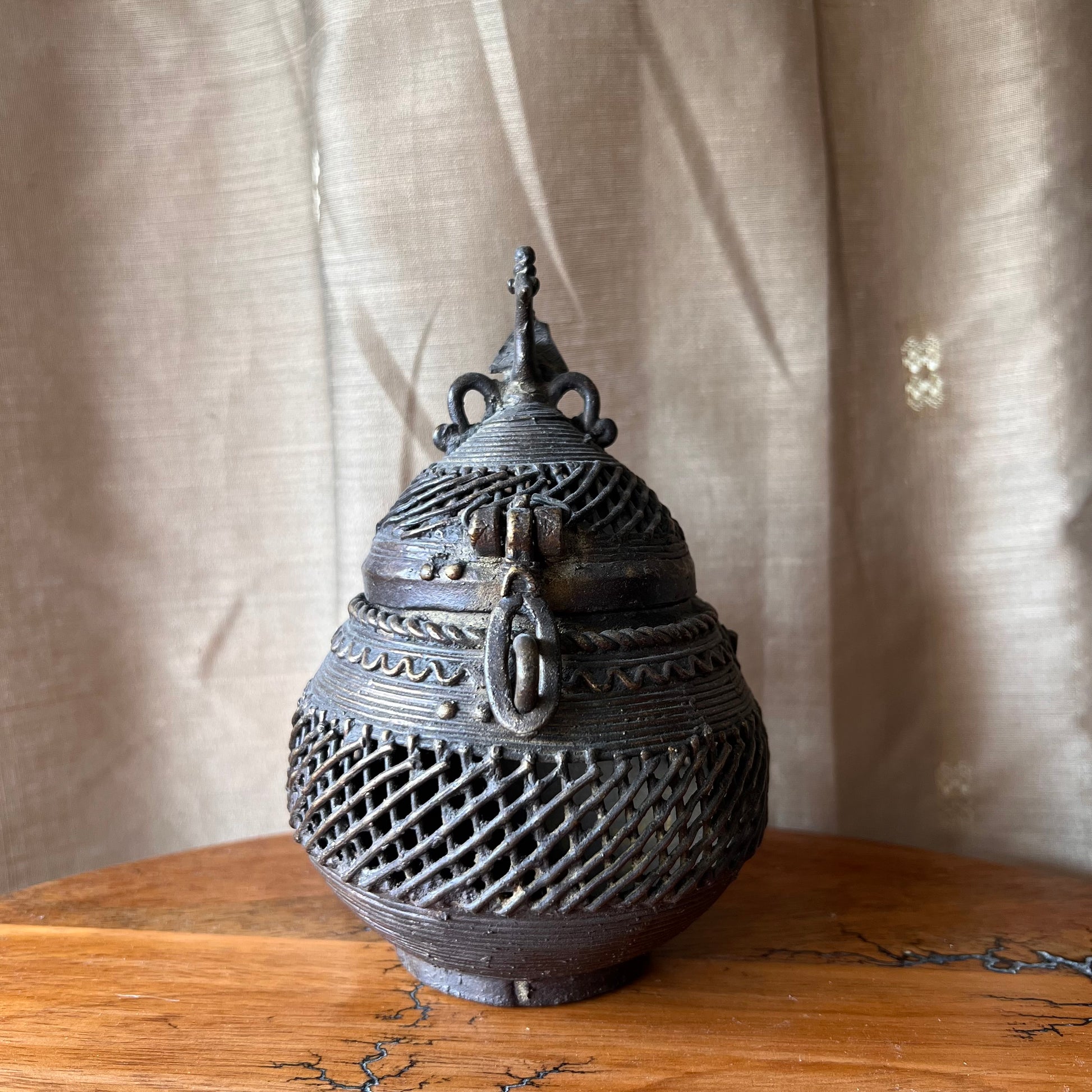 Ce petit objet artisanal vient du Bastar, une région de l'Inde connue pour son savoir-faire de diverses figurines en laiton. L'œuvre d'art vintage respire le charme et vous permet de rêver aux peuples tribaux lointains dans le paysage tropical et coloré de l'Inde. Les statues en laiton ont été fabriquées au début du 20e siècle et, en raison de leur âge, leur couleur peut varier du rougeâtre ou du brun au noir, en passant par le vert-bleuâtre et leur surface peut présenter des signes de vieillissement (comme de petites rayures).