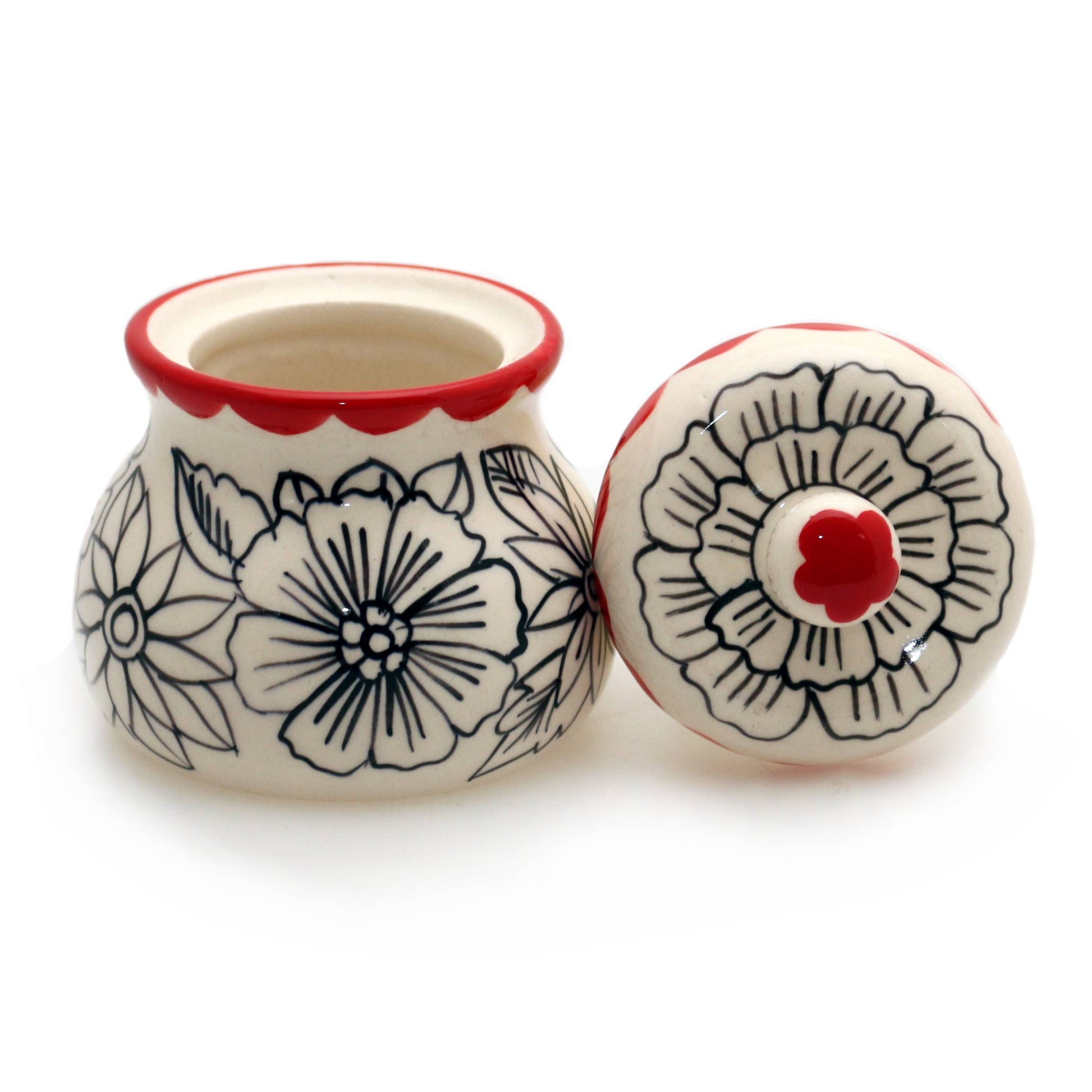 Le sucrier en noir, blanc et rouge est l'accessoire parfait pour votre café et votre thé. Il est non seulement pratique mais aussi élégant et ajoute une touche ludique à votre cuisine. Procurez-vous le sucrier maintenant et faites de chaque pause-café un moment fort !