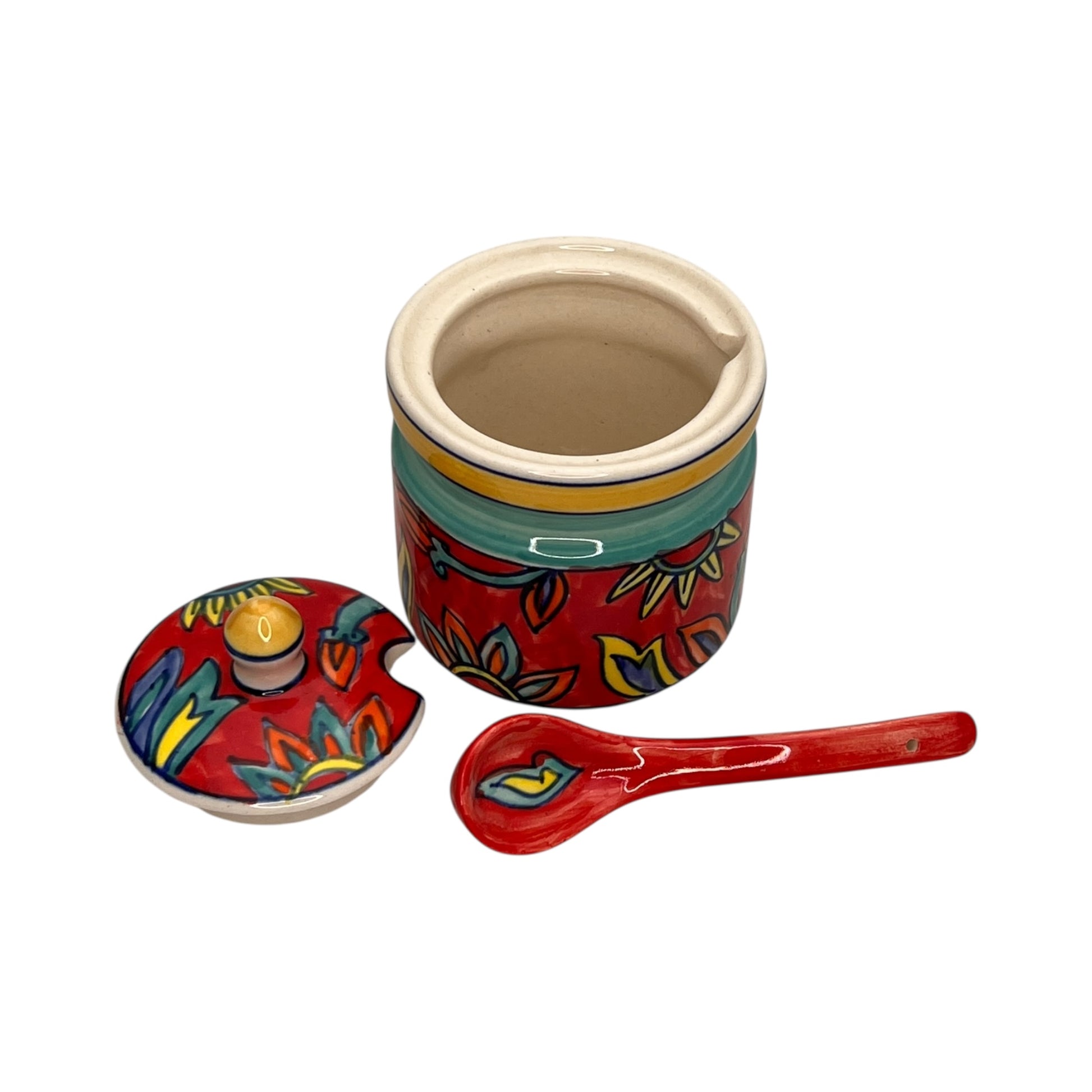 Ce sucrier peint à la main d'un rouge éclatant apporte une touche de charme à toute table basse. Avec son couvercle assorti et sa petite cuillère, il rend le service du sucre facile et agréable. Un objet décoratif qui met en valeur le sucre avec créativité !