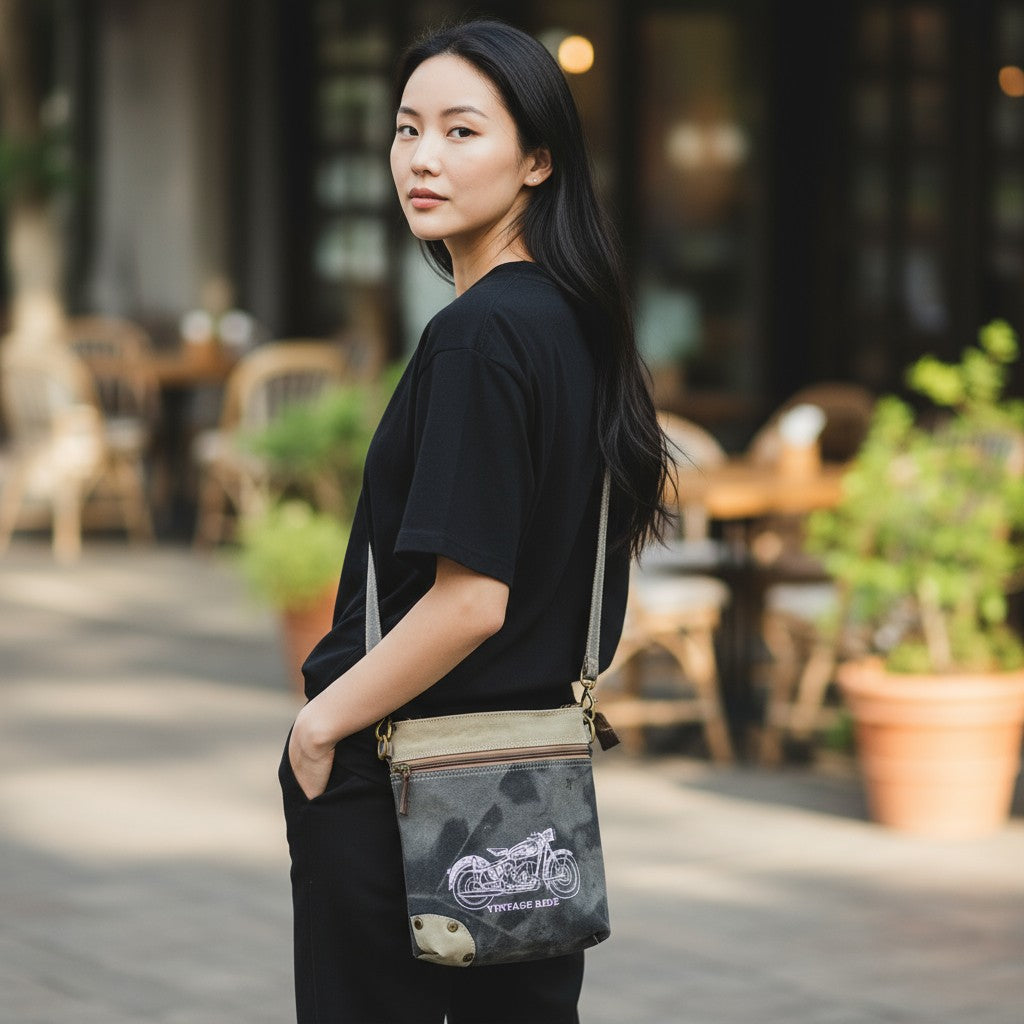Borsa a tracolla in tela realizzata a mano con dettagli in pelle di bufalo.