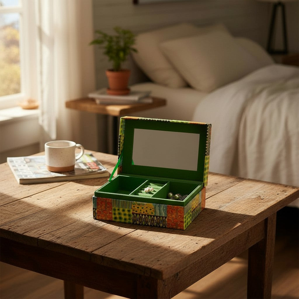 Questo colorato portagioie dall'esclusivo design camaleontico offre ampio spazio per i tuoi preziosi gioielli. Con i suoi numerosi scomparti e scomparti, è perfetto per riporre in modo ordinato anelli, collane, orecchini e altri accessori.