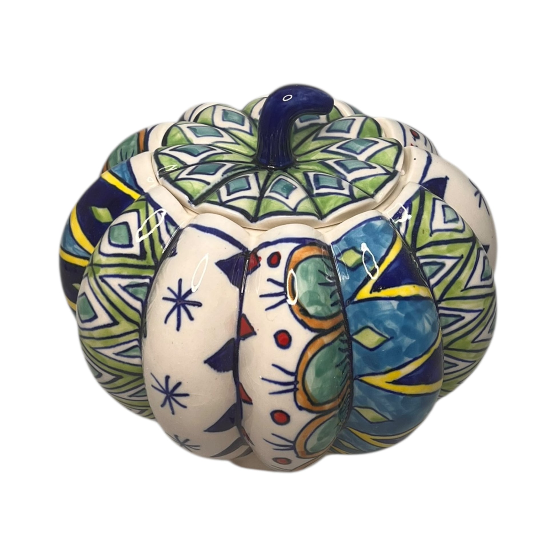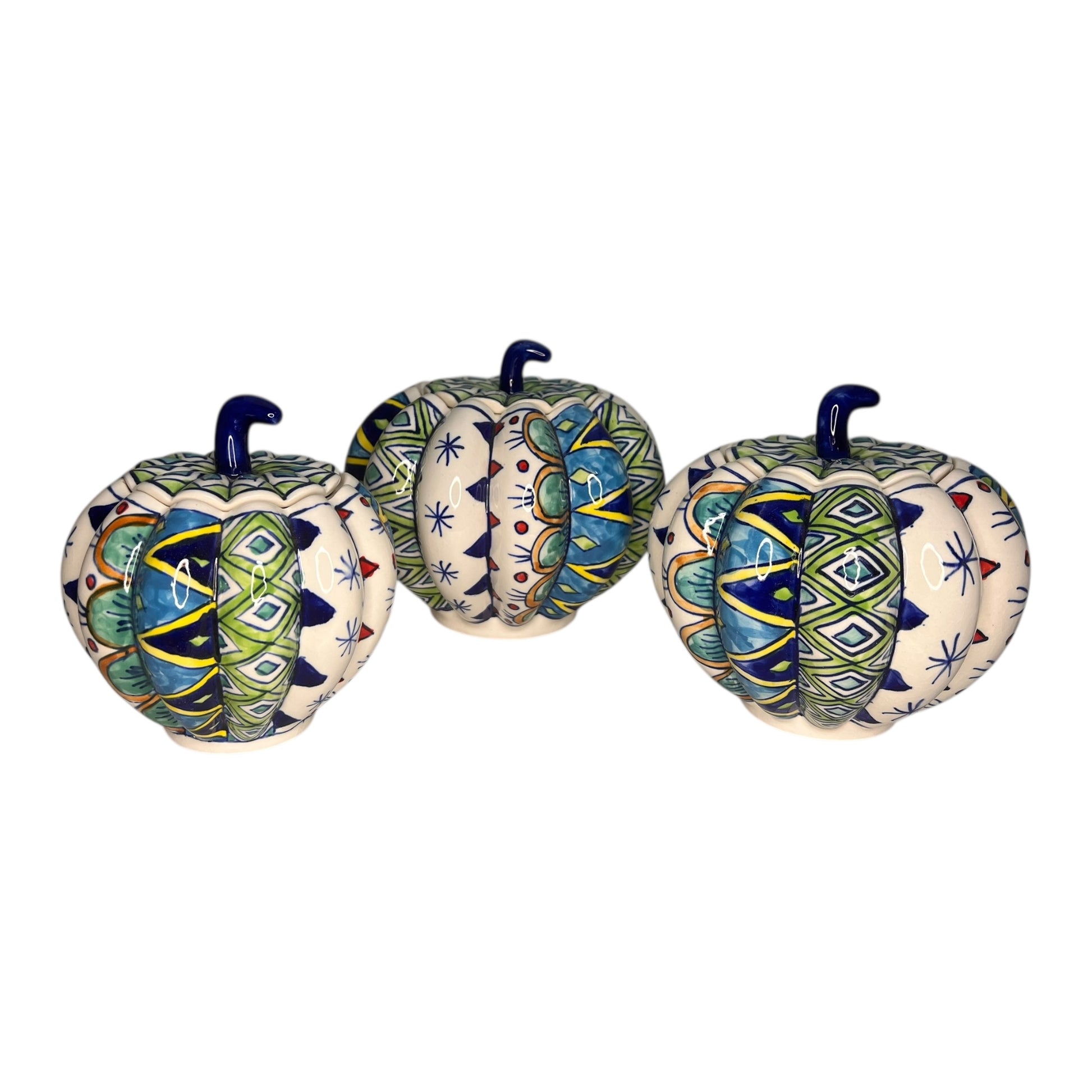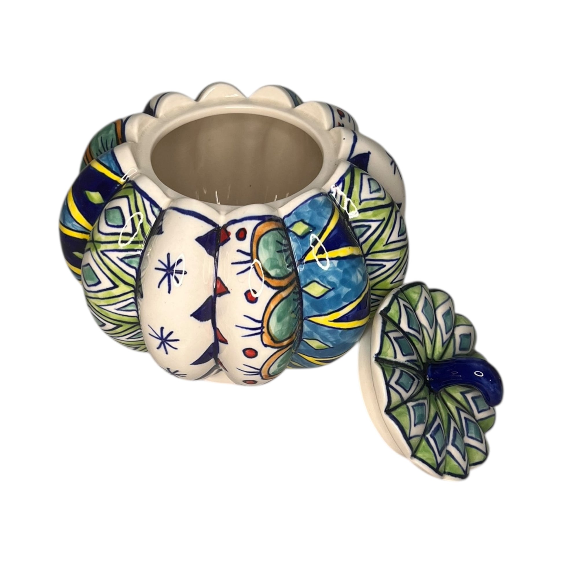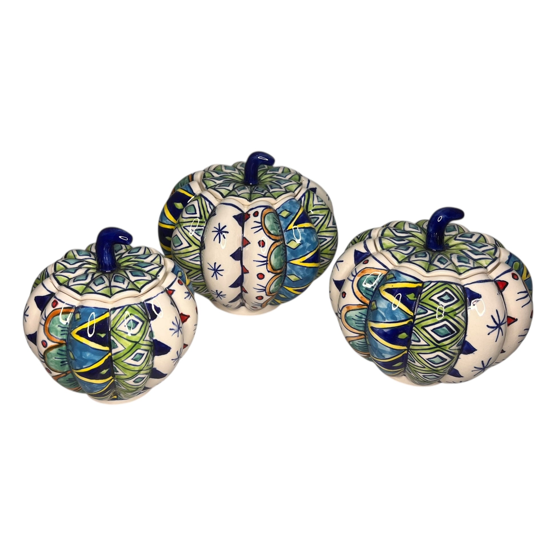 Tre contenitori decorativi con coperchio di diverse dimensioni, caratterizzati da un grazioso motivo a zucca. Ogni contenitore è dipinto a mano con cura e aggiunge un tocco di calore alla tua casa.