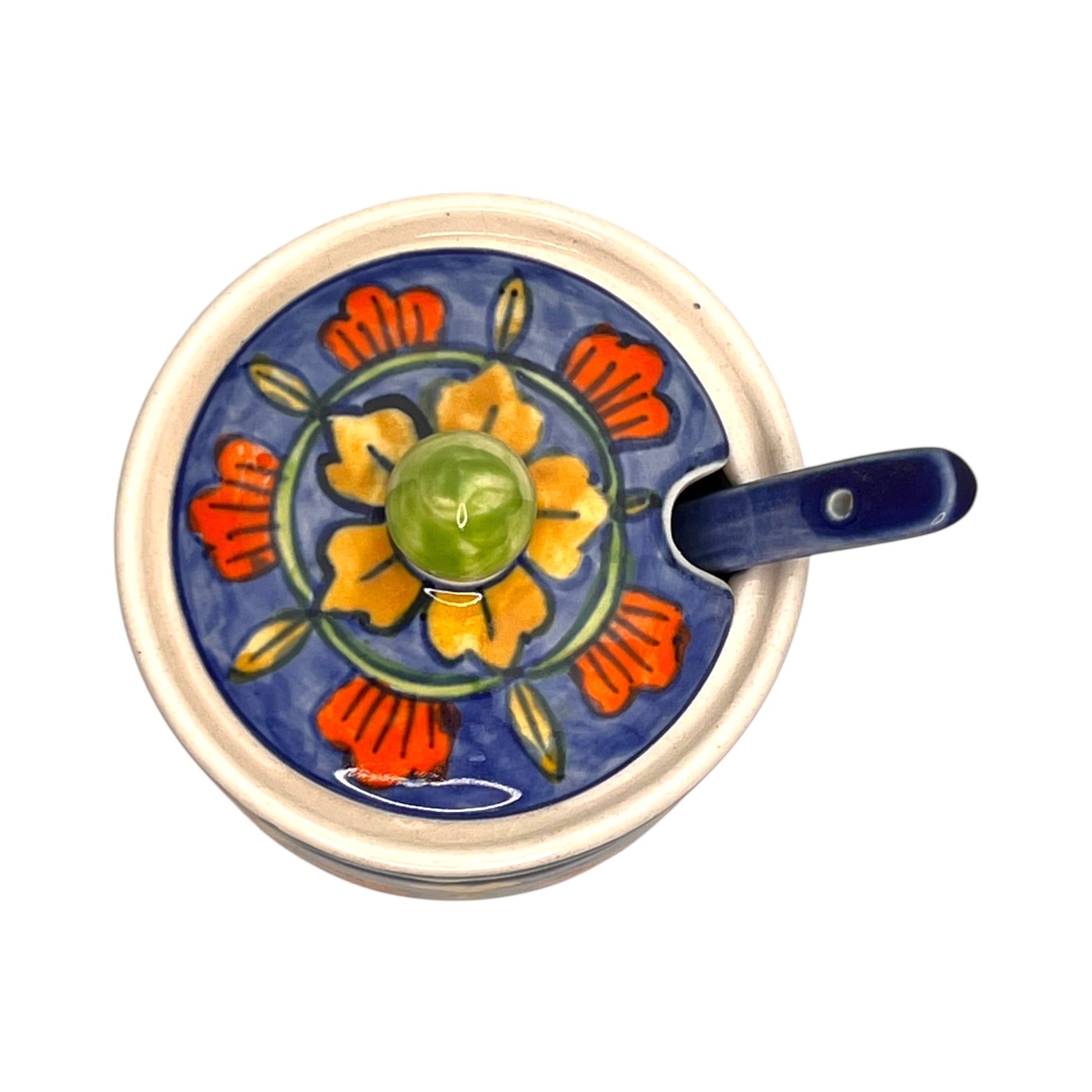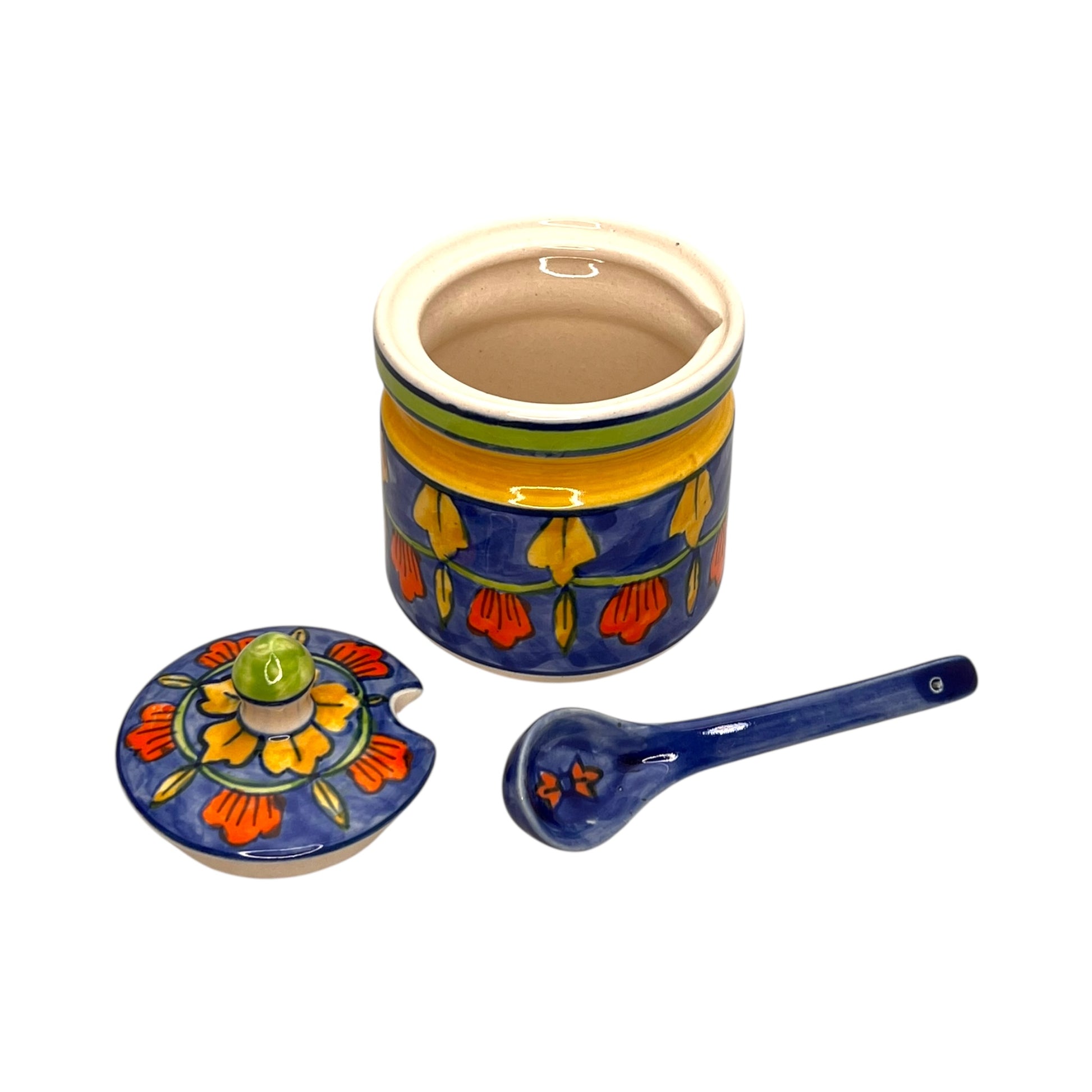 Questa zuccheriera dipinta a mano in un vivace blu aggiunge un tocco di fascino a qualsiasi tavolino da caffè. Con il suo coperchio coordinato e il cucchiaino, rende la distribuzione dello zucchero semplice e incredibilmente piacevole. Un dolce colpo d'occhio che presenta lo zucchero in modo creativo!