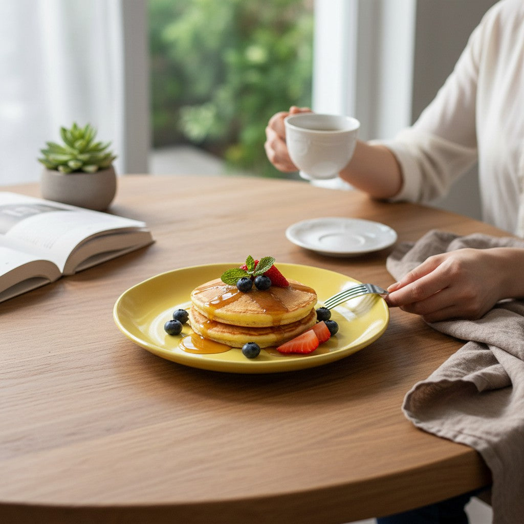 Questo piatto da colazione con il suo bordo curvo offre un look unico alla tua colazione. La parte superiore è di un giallo allegro, mentre la parte inferiore brilla di un verde brillante. Gusta la tua colazione con questo piatto originale e colorato!
