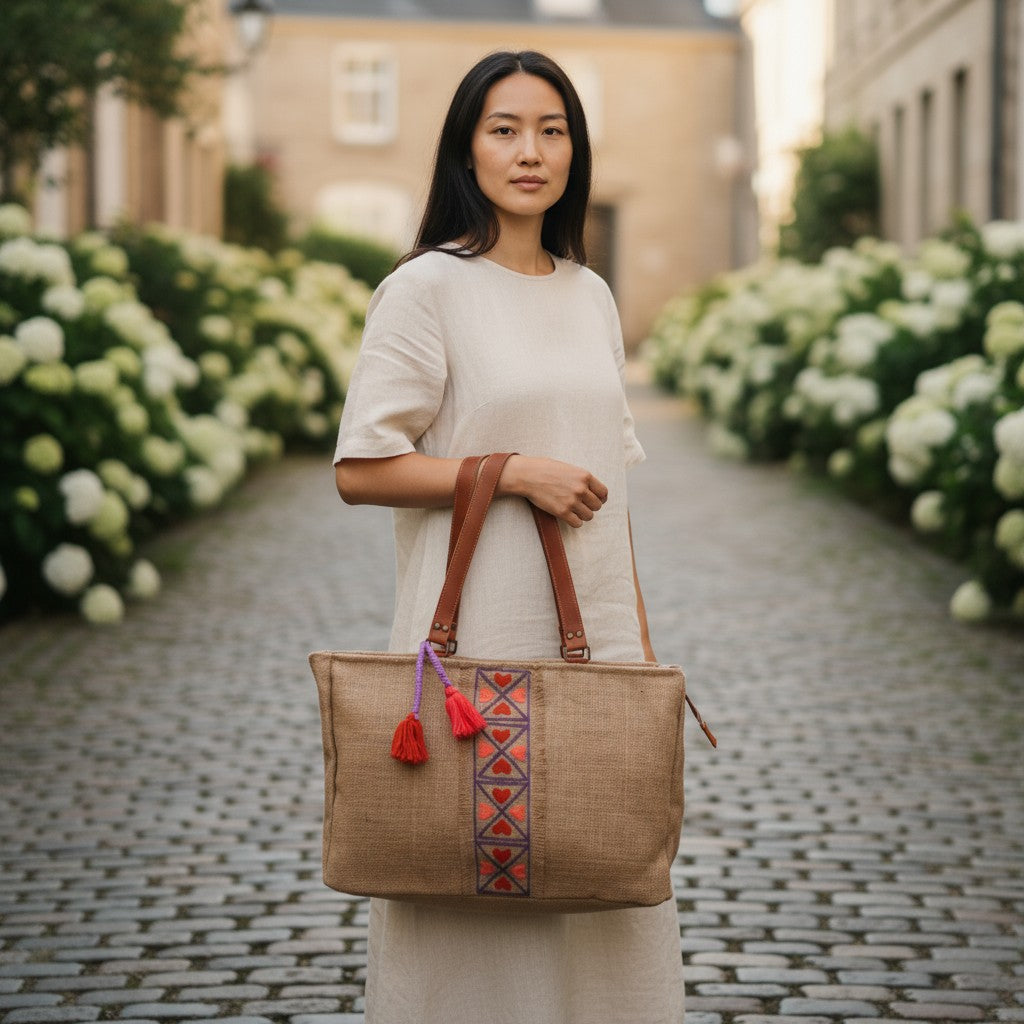 La combinazione di iuta sostenibile ed eleganti cinturini in pelle rende questa borsa fatta a mano un accessorio pratico ed elegante per la vita di tutti i giorni, lo shopping e il tempo libero.