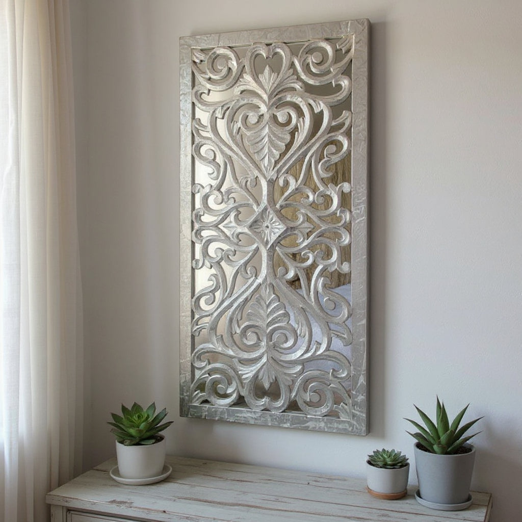 Questo ornamento decorativo da parete in legno con specchio in stile shabby chic è un vero colpo d'occhio per gli amanti del look antico. La cornice intagliata in argento conferisce un'atmosfera elegante e nostalgica a qualsiasi ambiente.