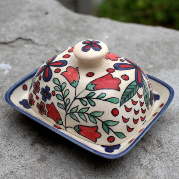 Diese elegante Butterdose mit zeitlosem, handbemaltem blumigen Dekor in Blau ist perfekt für alle, die auf etwas Ausgefallenes und Wertiges Wert legen. Die hochgebrannte Keramik vereint Funktionalität mit künstlerischer Schönheit.