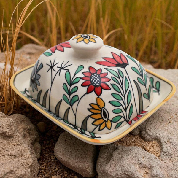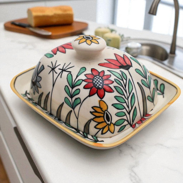 Diese elegante Butterdose mit zeitlosem, handbemaltem blumigen Dekor in Gelb ist perfekt für alle, die auf etwas Ausgefallenes und Wertiges Wert legen. Die hochgebrannte Keramik vereint Funktionalität mit künstlerischer Schönheit.