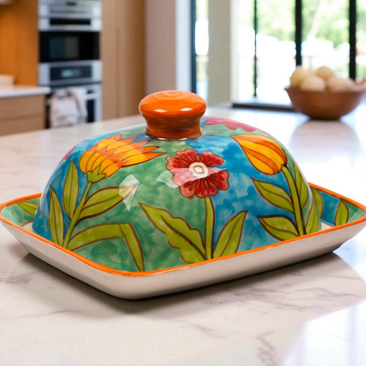 Unsere wunderschöne Keramik Butterdose mit Blumenmuster ist ein echter Hingucker für jeden Frühstückstisch. Handgefertigt und liebevoll handbemalt, bringt sie Farbe und Stil in Ihre Küche.
