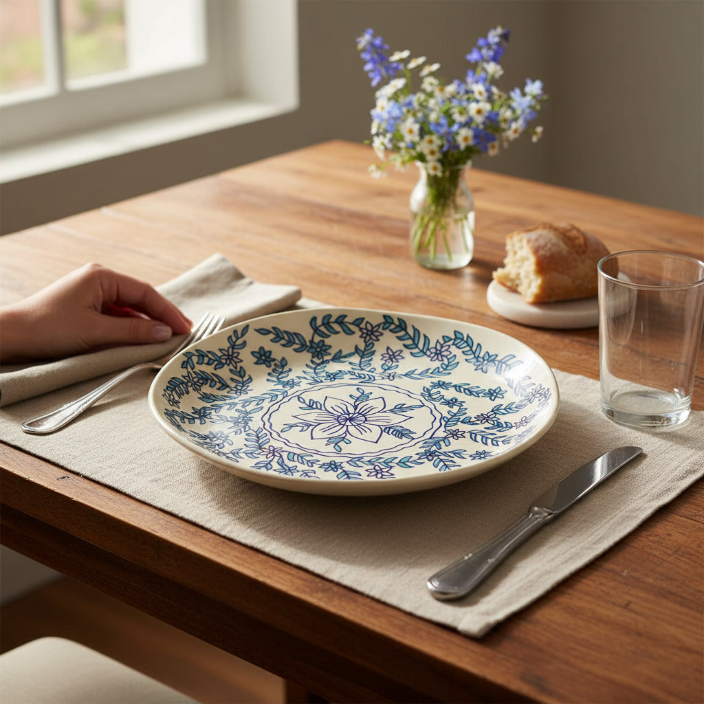 Handgefertigter Speiseteller mit blauem Blumenmotiv