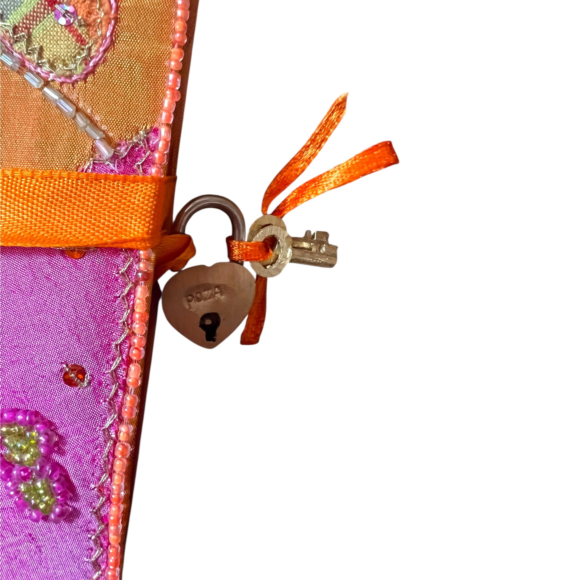 Einzigartige Handwerkskunst: Dieses liebevoll handbestickte, stoffgebundene Poesiealbum ist ein wahres Unikat. Die handgeschöpften orangenen Seiten verleihen jedem Eintrag eine besondere Note.