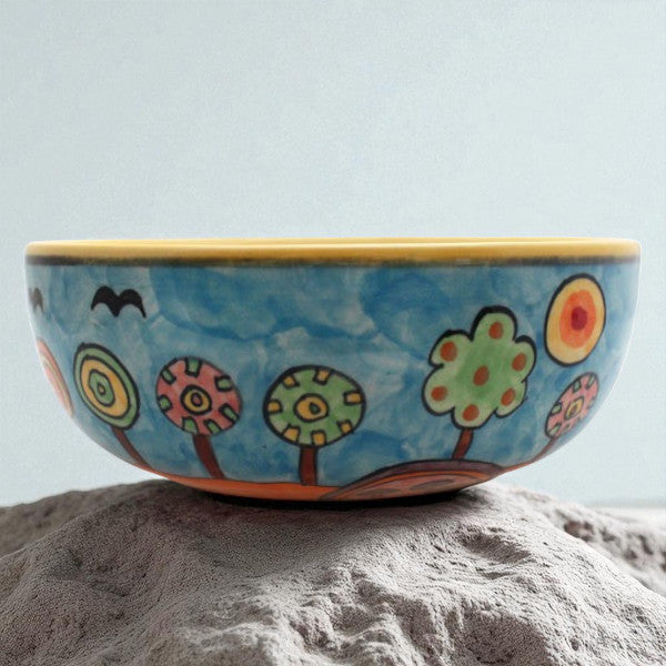 Diese charmante kleine Salatschüssel besticht durch ihre naive Malerei und bunte Farbgebung. Jede Schüssel ist ein handbemaltes Unikat aus hochwertiger Keramik und bringt fröhliche Farben auf Ihren Tisch.