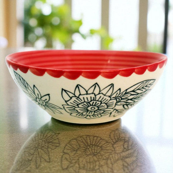 Diese elegante weiße Keramikschale besticht durch ihren charakteristischen roten Rand und die kunstvoll aufgemalten schwarzen Blumenmotive. Die handgefertigte Schale aus der Black Flower Kollektion vereint zeitlose Eleganz mit funktionalem Design.