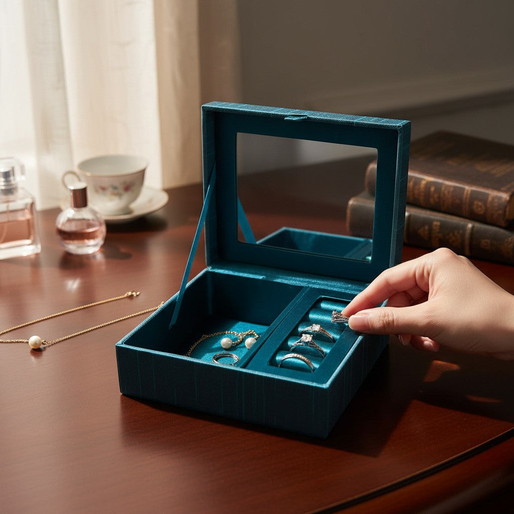 Handbestickte Schmuckschatulle in Türkis mit Spiegel und Ringhalter