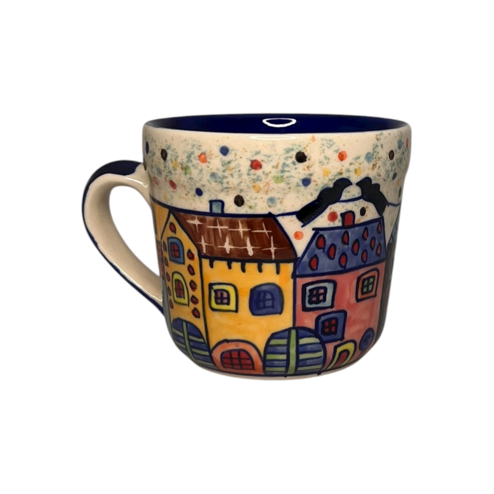 Handbemalte Keramiktasse mit buntem Häusermotiv