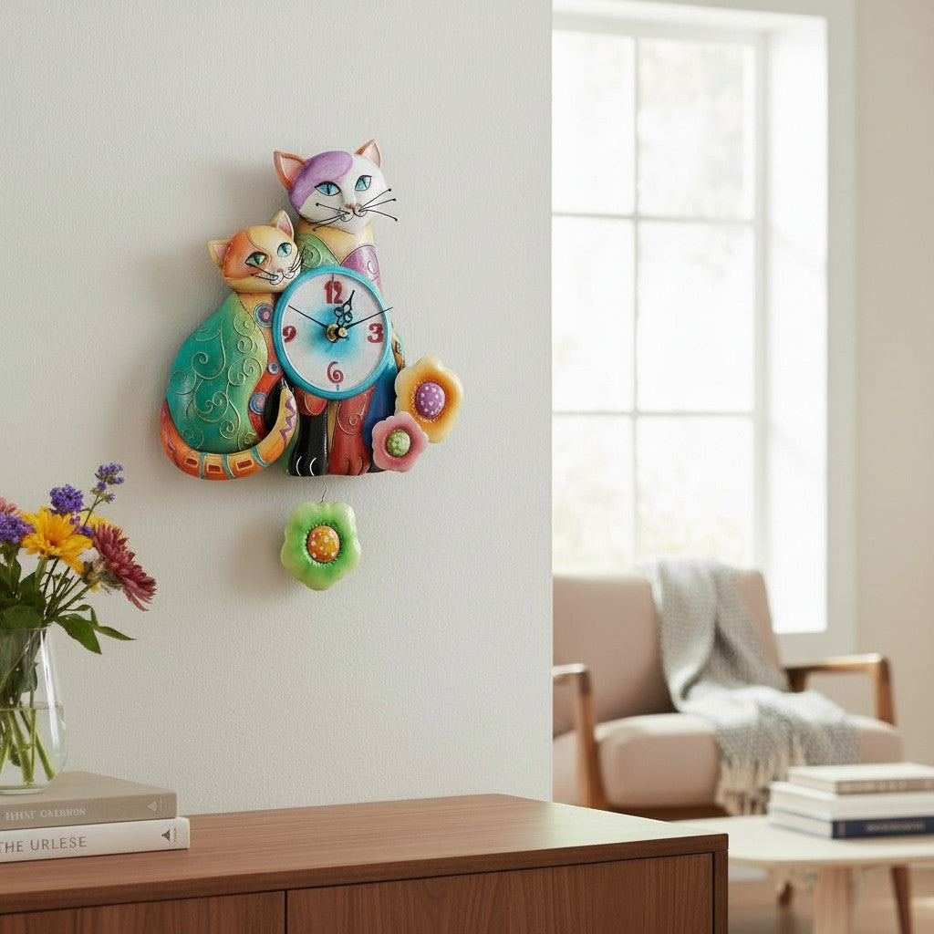Verleihen Sie Ihren Räumen eine fröhliche, persönliche Note mit dieser kunstvollen Katzenuhr, die nicht nur die Zeit anzeigt, sondern auch für gute Laune sorgt.